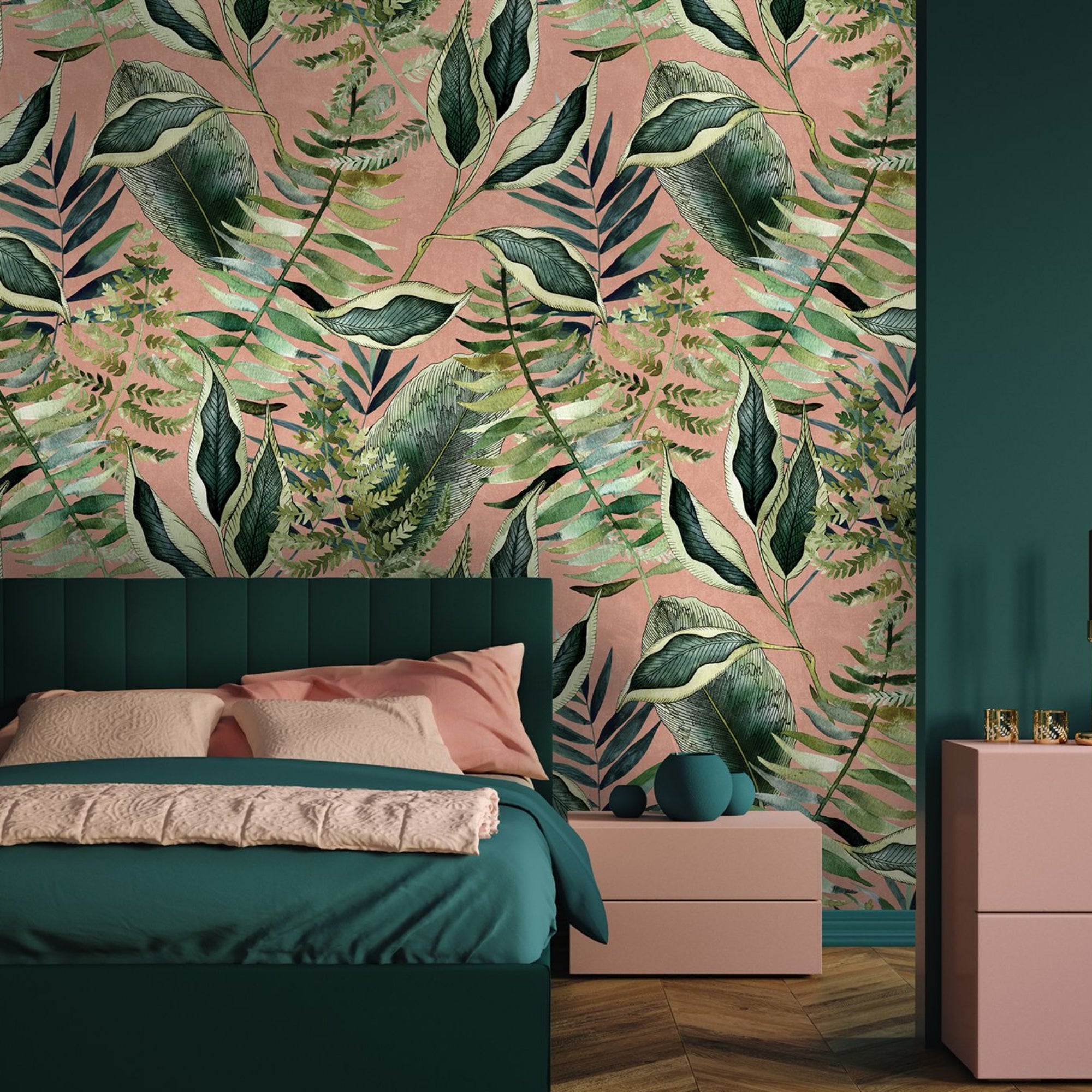 A stylish feature wallpaper showcasing an array of lush foliage plants in a vibrant eye catching design. The Blush Tropical Wallpaper is an extravagant and exotic choice that will give your space the feeling of an endless summer.