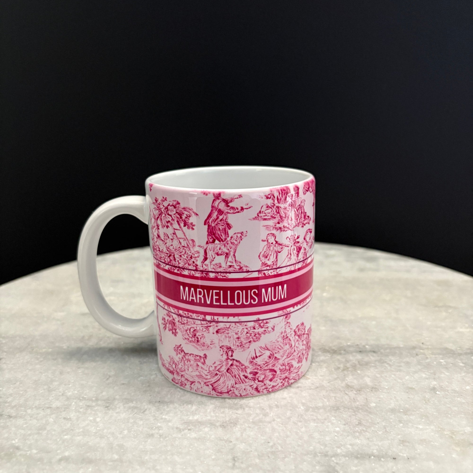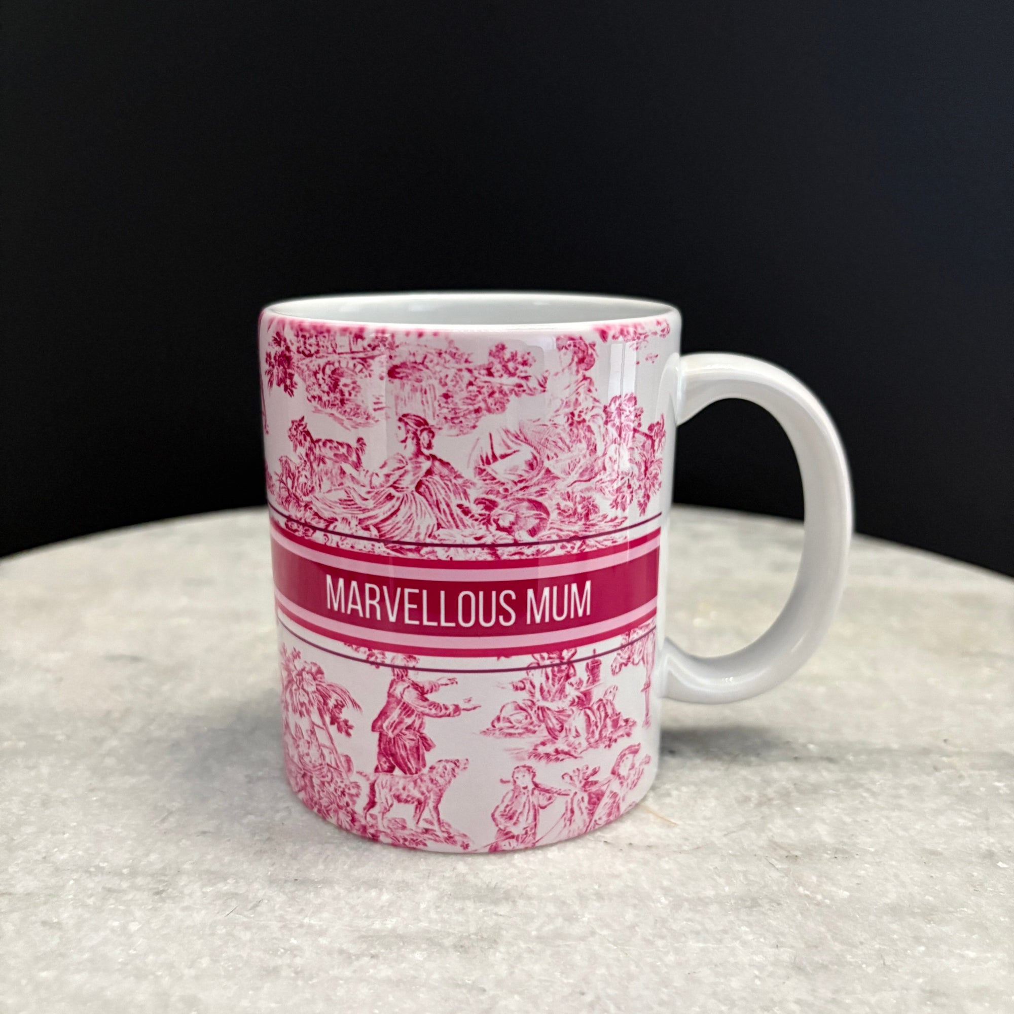 Beautiful and eye-catching, the Mum Mug is a heartfelt celebration of all things mum. Adorned with a pretty pink toile design, this ceramic mug showcases the words "MARVELLOUS MUM" at the centre making it as charming as it is meaningful.
