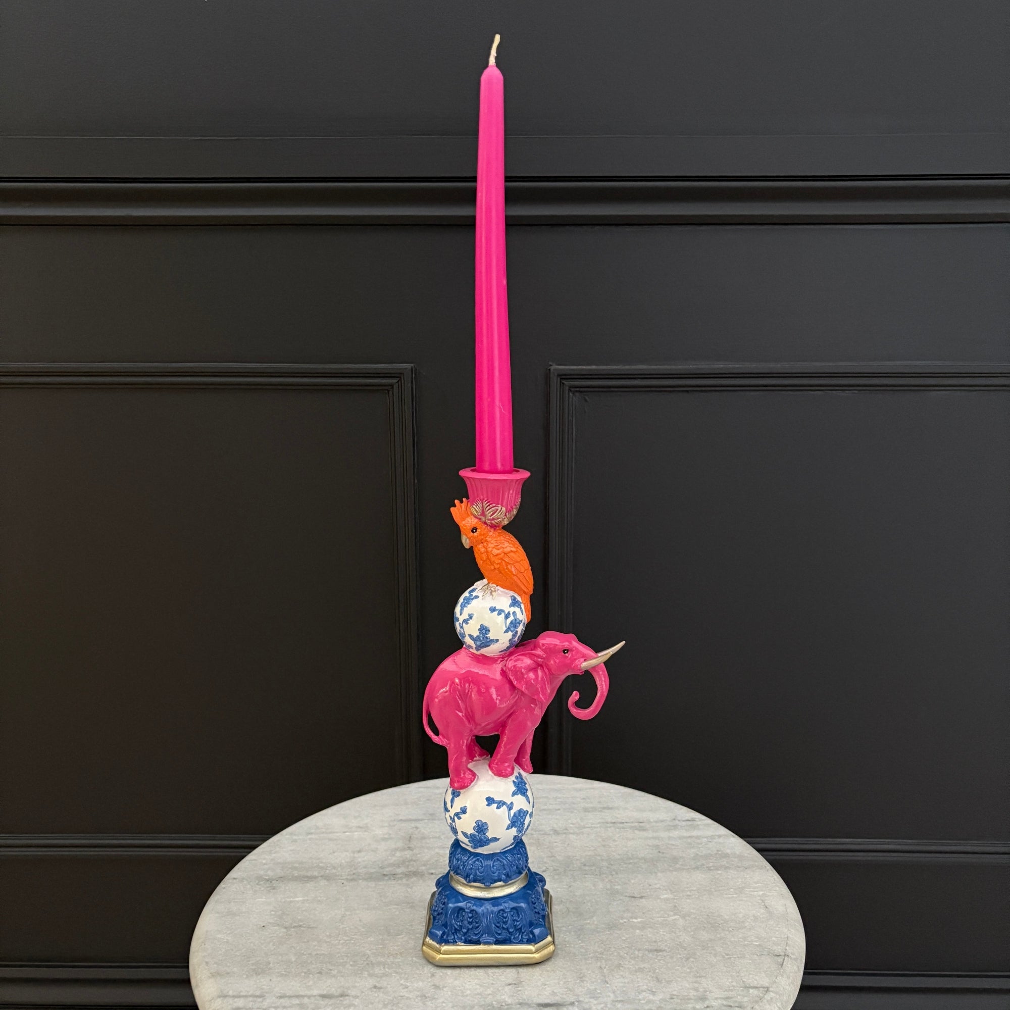 Add a splash of colour and personality to your home with this striking Candle Holder, a unique decorative accessory designed to delight and inspire. Featuring a beautifully detailed parrot perched above a pink elephant, this playful candlestick brings an eclectic and joyful charm to any space. Intricate craftsmanship brings each character to life, with the parrot showcasing elegant gold beak and feet while the elephant stands proudly below, creating a captivating contrast.