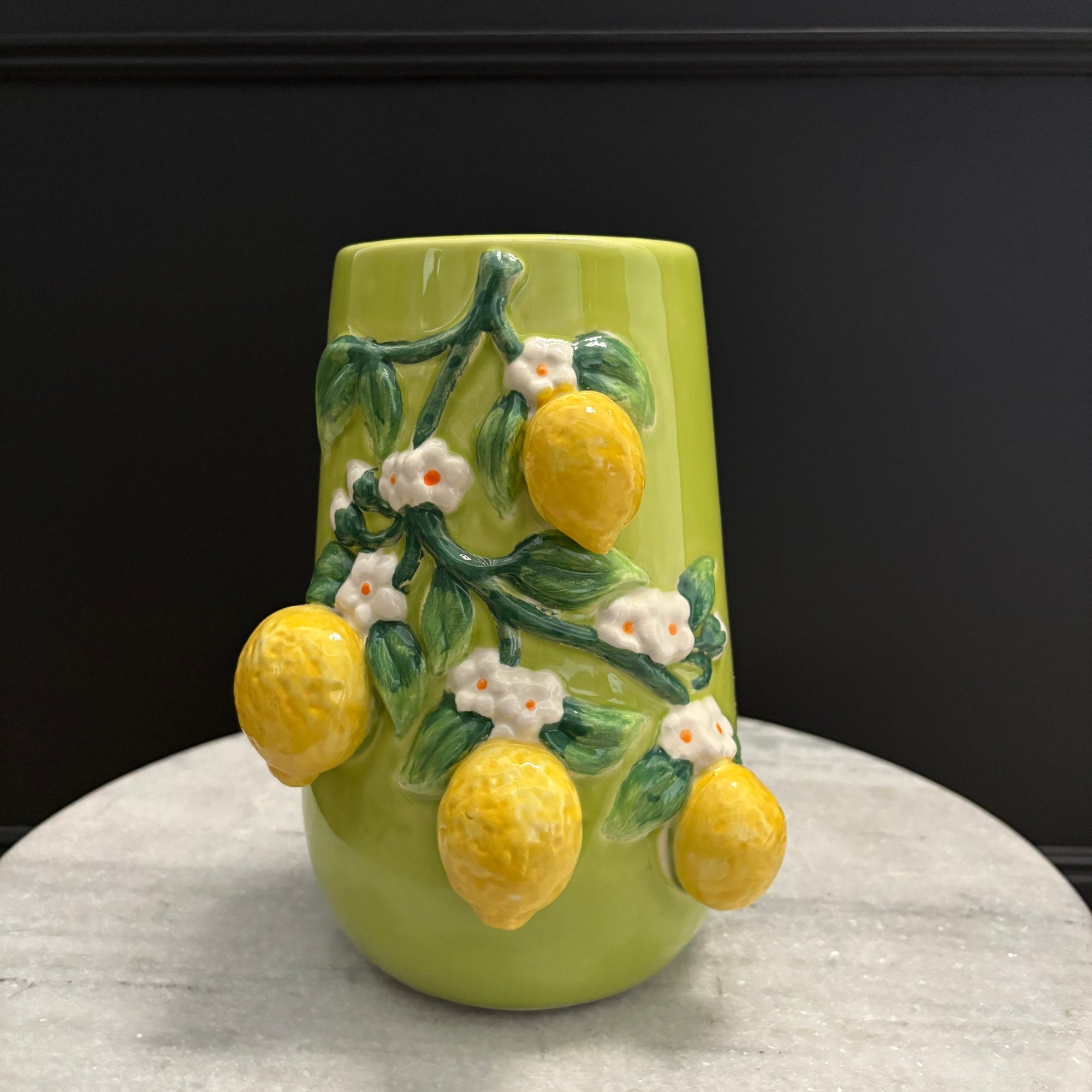 The layered botanical detailing creates a sense of movement and texture, transforming this piece from a simple vase into an artistic object in its own right. Inspired by the relaxed elegance of Italian citrus groves, it introduces warmth, colour, and character to any interior setting.