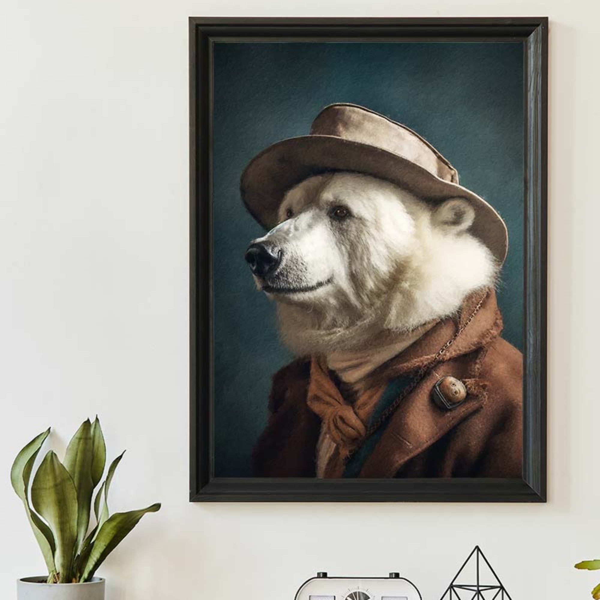 Totally quirky the Polar Bear Art will instantly bring a humorous edge and beguiling look to your home. Featuring a portrait of a dapper bear dressed to impress, anyone who loves unusual home decor will love this fabulous animal print.