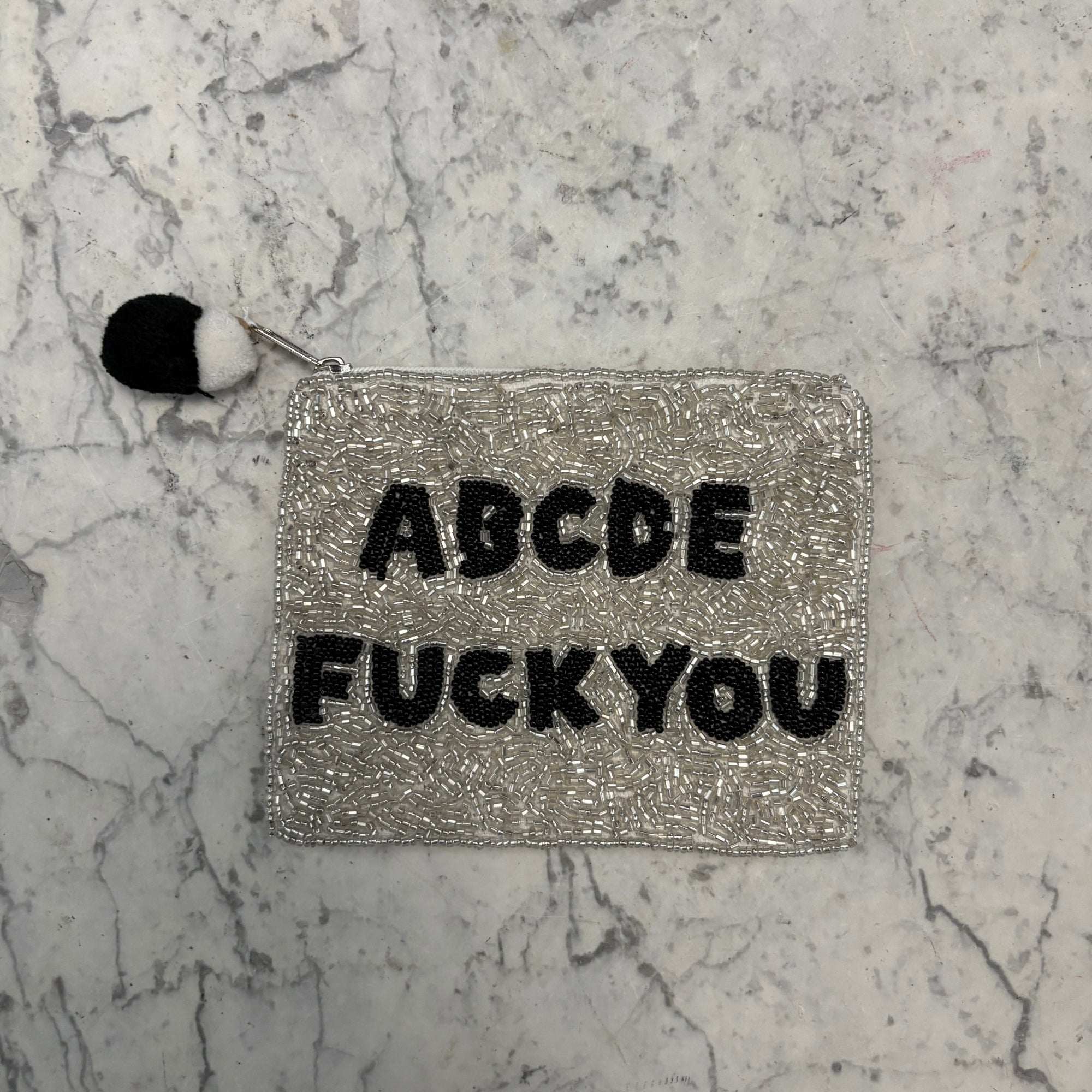 Playful, bold, and full of personality, the Beaded Coin Pouch is a standout accessory designed to add humour and creativity to your everyday essentials. Hand-beaded with the cheeky text “ABCDE FUCKYOU” in black beads, it’s a witty purse that won’t go unnoticed. The design is finished with a coordinating black-and-white fabric charm, a soft fabric lining, and a matching fabric back for a stylish and durable finish.