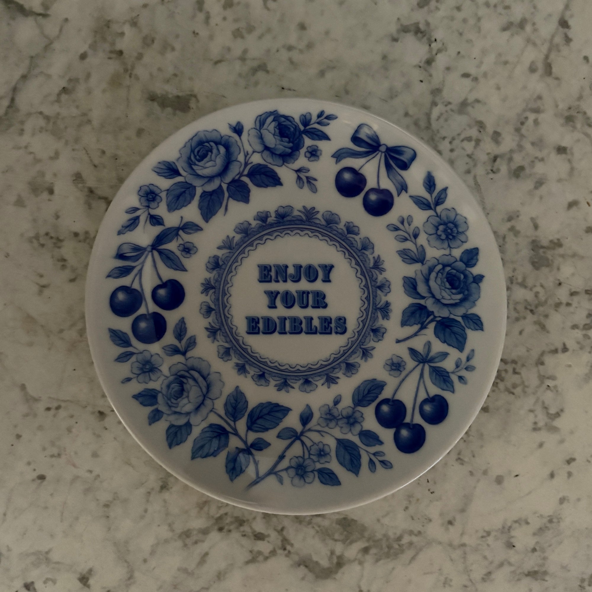 Amusing and beautiful, this Blue Plate offers a fresh, playful twist on classic blue and white ceramics. Featuring a charming palette of delicate florals, cherries, and bows, the design is brought to life with the cheeky phrase "ENJOY YOUR EDIBLES" boldly printed across the centre in coordinating blue lettering.