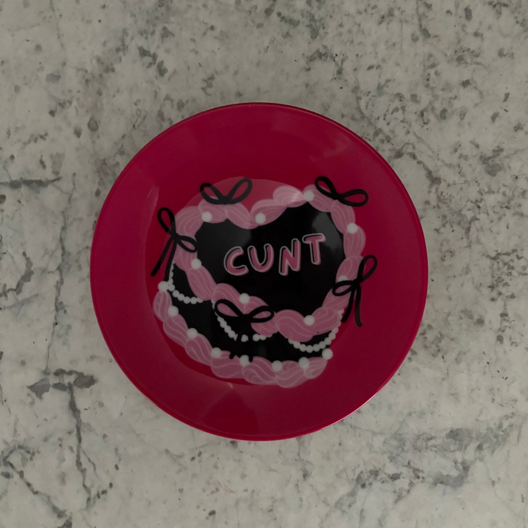 Colourful, daring, and unapologetically bold, this Cake Plate is a cheeky twist on classic kitsch. Showcasing a striking black heart-shaped cake adorned with pink and white icing, complete with decorative black bows, this vibrant design features the word "CUNT" boldly displayed across the centre in playful pink and white lettering.