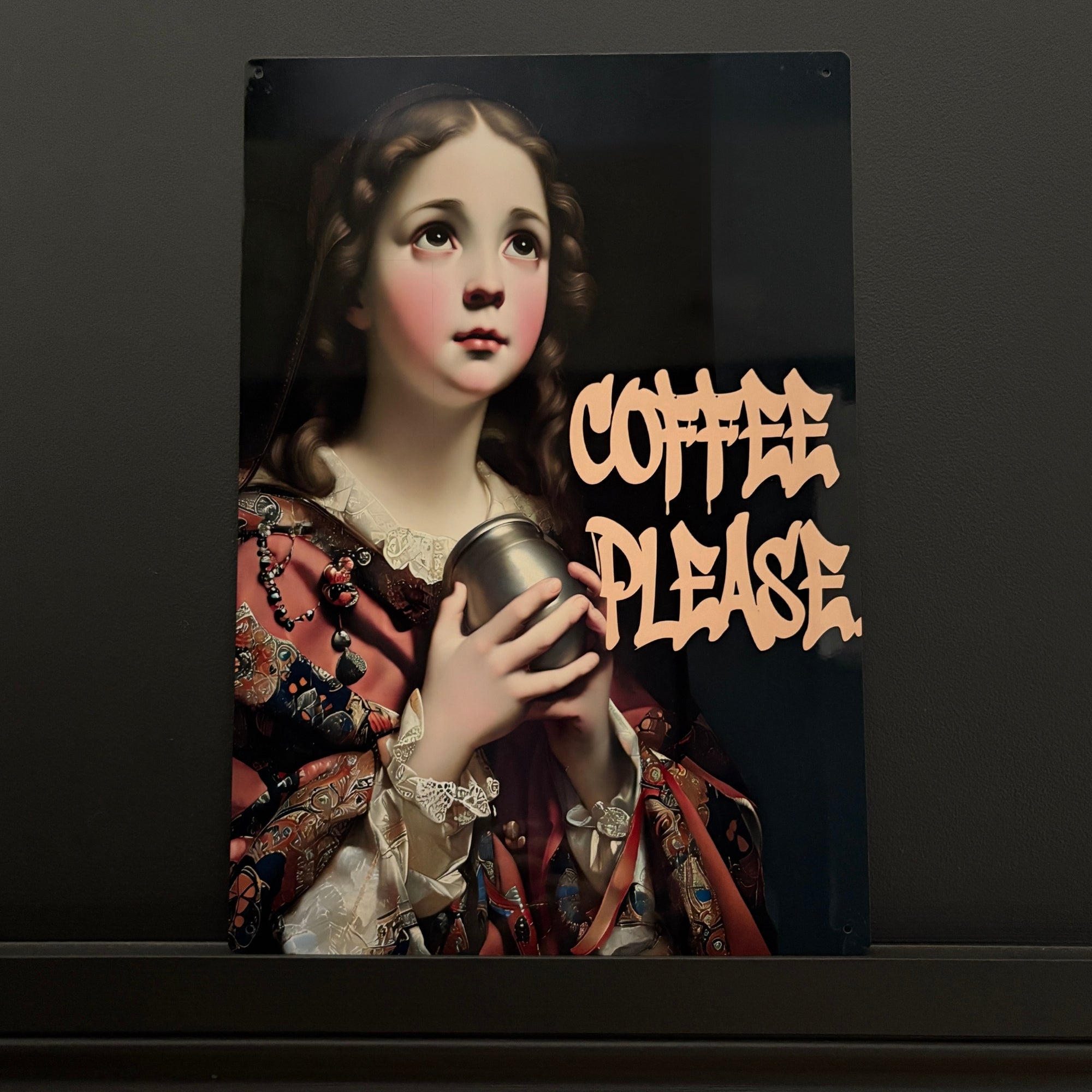 This unique sign features the playful phrase “Coffee Please” rendered in a graffiti-style font, set alongside a historic-style painting of a young girl holding a cup. The contrast between old-world art and contemporary street-style lettering creates a striking, eye-catching piece of wall art that’s sure to spark conversation. Fun, practical, and full of personality, the Coffee Sign makes a memorable addition to any space.