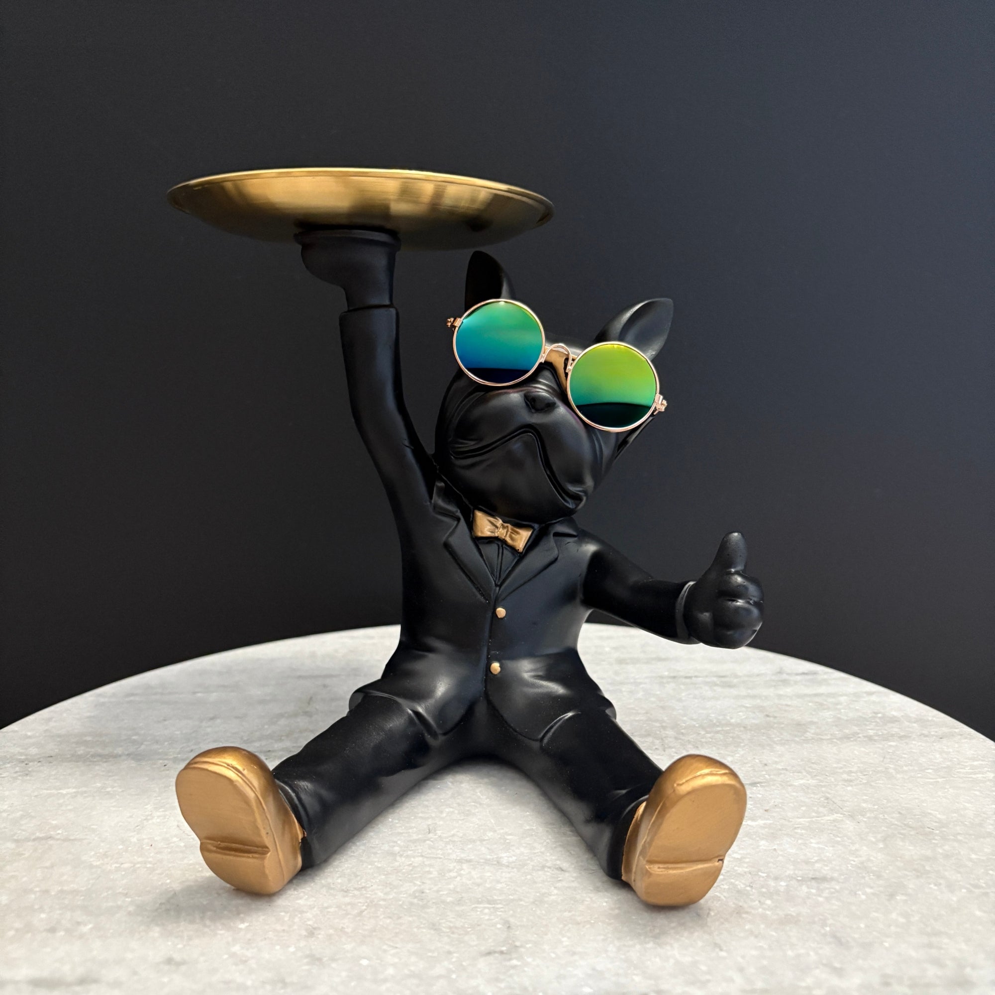 Welcome the ultimate in quirky decor into your home with the Display Stand, this black dog is dressed to impress, sporting sleek gold sunglasses plus an additional pair of mirrored sunglasses to use as and when required. This home accessory showcases a cool dog raising a gold tray that’s perfect for holding sweets, jewellery, snacks, keys, and other small essentials. Please note the tray can be attached to the dogs hand if required using the sticky pad supplied.