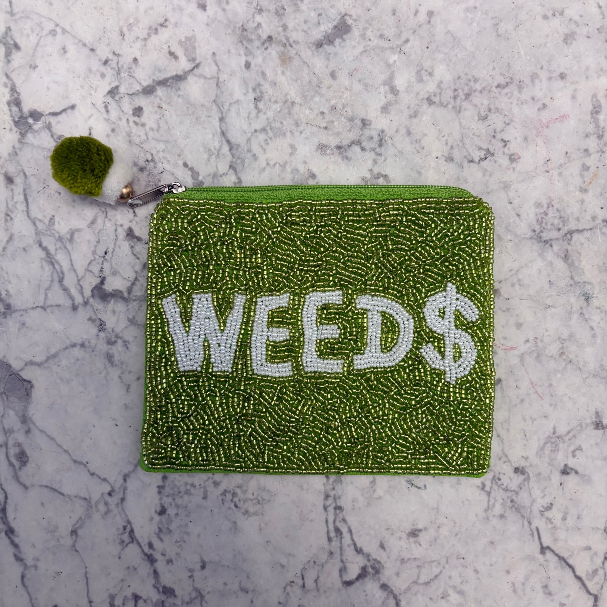 Amusing and eye-catching, the Green Purse is a bold accessory for those who love to stand out. Hand-beaded with the cheeky phrase “WEED$” in crisp white beads across the front, it’s a playful design that adds both humour and creativity to your collection. The look is completed with a coordinating green and white purse charm, along with a soft fabric lining and back for durability and everyday use.