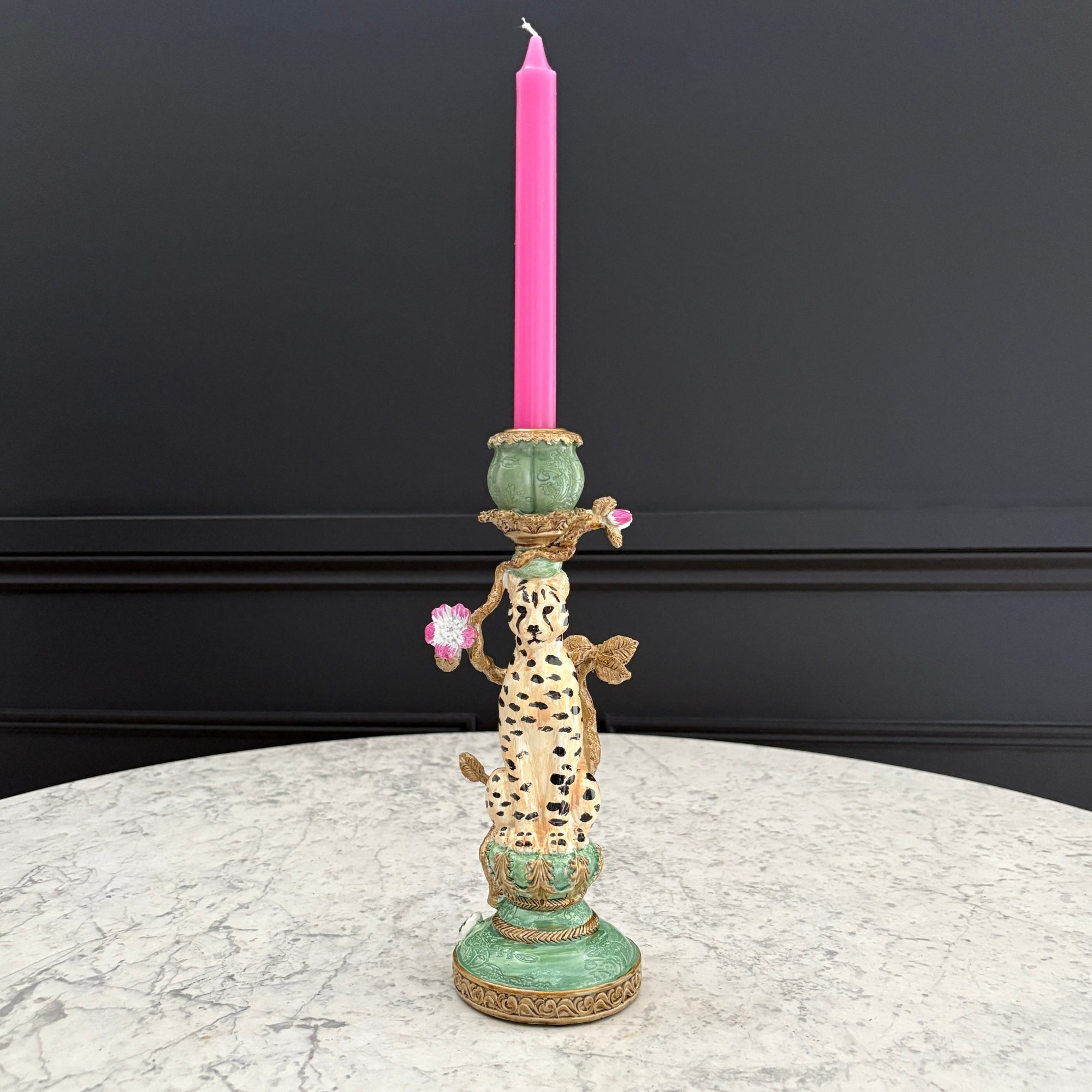 The gold branch is adorned with delicate foliage and pink flowers, creating a rich, botanical contrast to the wild beauty of the leopard below. At the top, the branch holds a single candle, making this piece perfect for creating soft, atmospheric lighting in any room.