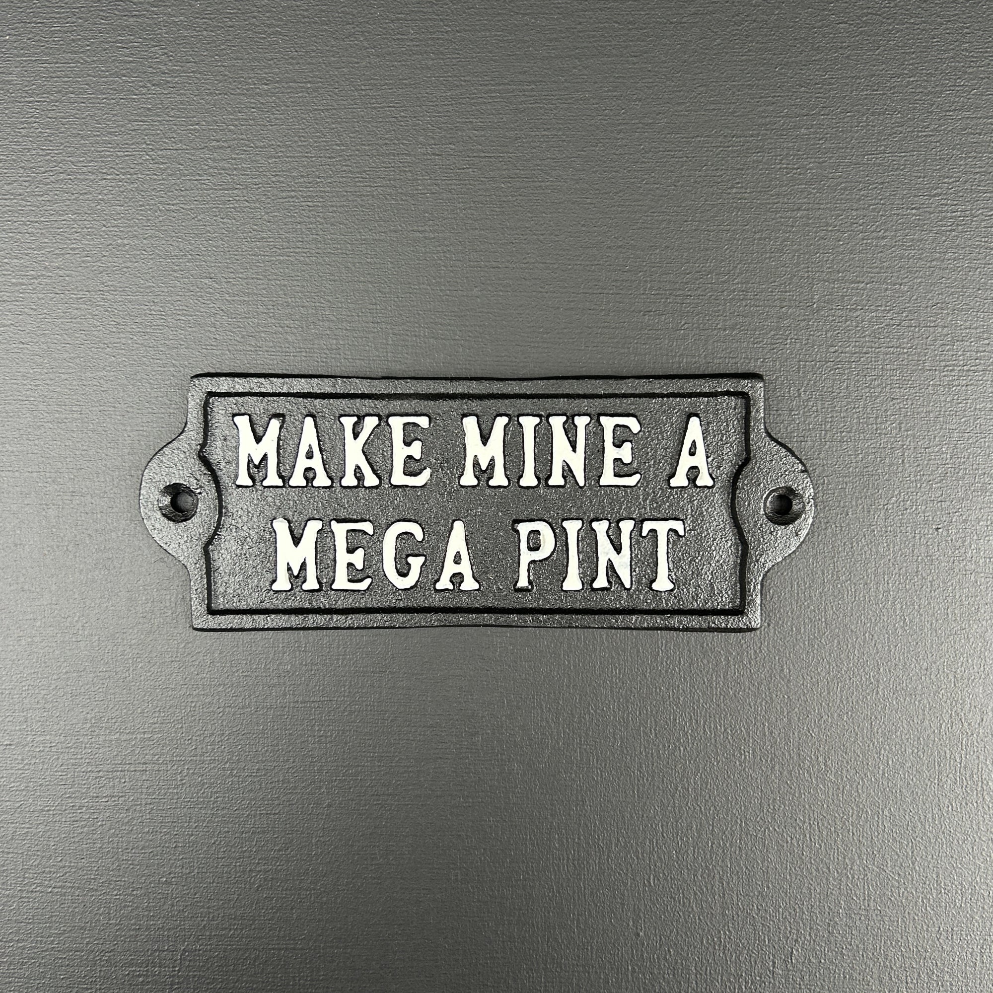 This humorous Metal Sign Plaque is designed to make a statement, crafted from solid black metal, it features white lettering that cheekily declares, "Make Mine A Mega Pint." Perfect for adding a playful touch to your kitchen, home bar, or entertainment space, this sign brings a bit of attitude and fun to your home décor.