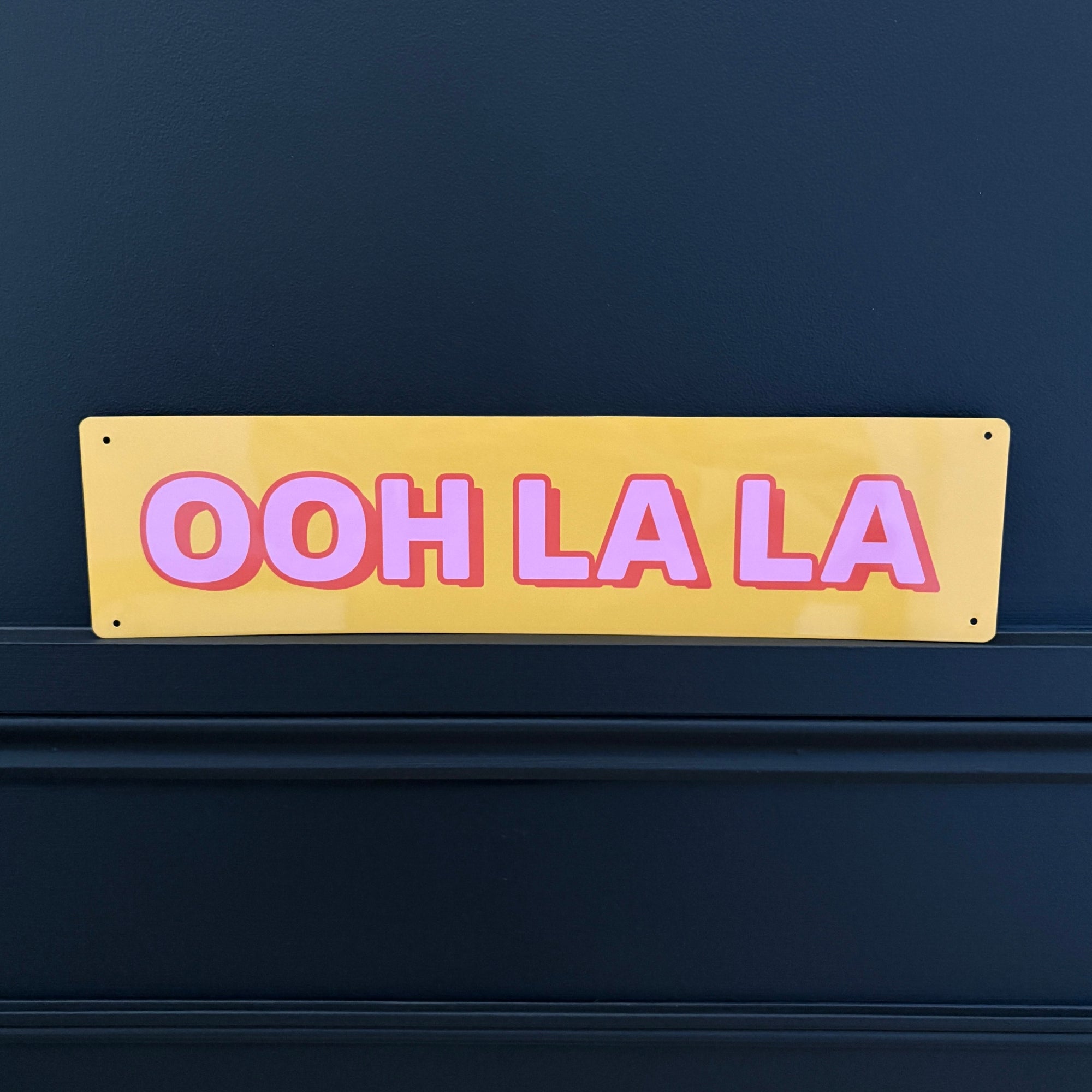 Add colour and playful charm to your space with this wall sign that says Ooh La La, a stylish home accessory that’s as fun as it is durable. Crafted from aluminium, this sign is designed to stand the test of time and is suitable for both indoor and outdoor use. With four pre-drilled holes in the corners, it’s quick and easy to install wherever you’d like to make a statement.