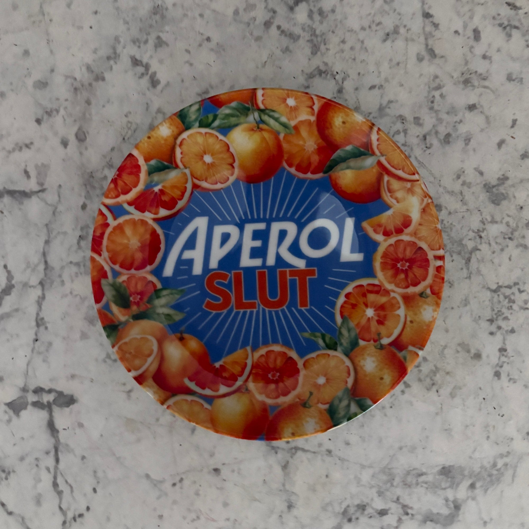 Fun, fabulous, and bursting with juicy zest, this Orange Plate / Trinket Dish is the perfect home accessory for anyone who loves a good spritz and a splash of style. Showcasing a vibrant design of orange slices, fruit and foliage the ceramic plate features the very cheeky phrase "Aperol Slut" at the centre in bold lettering.
