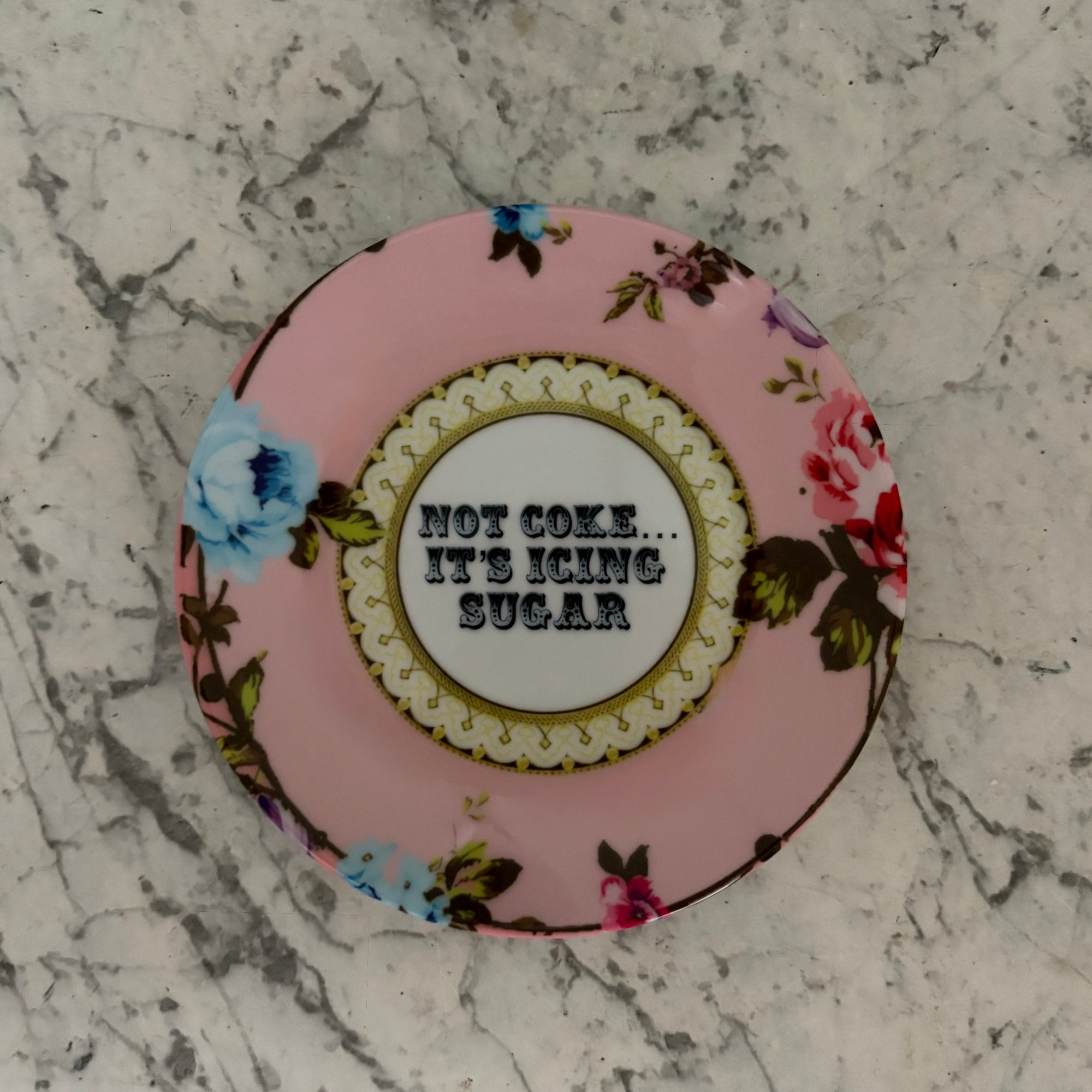 Daring, witty, and guaranteed to raise a smile, the Pink Sugar Dish is a cheeky twist on traditional home accessories. Showcasing a delicate floral design with the bold phrase “NOT COKE... IT’S ICING SUGAR” front and centre in black lettering, this fun and fabulous decorative plate delivers equal parts charm and humour.