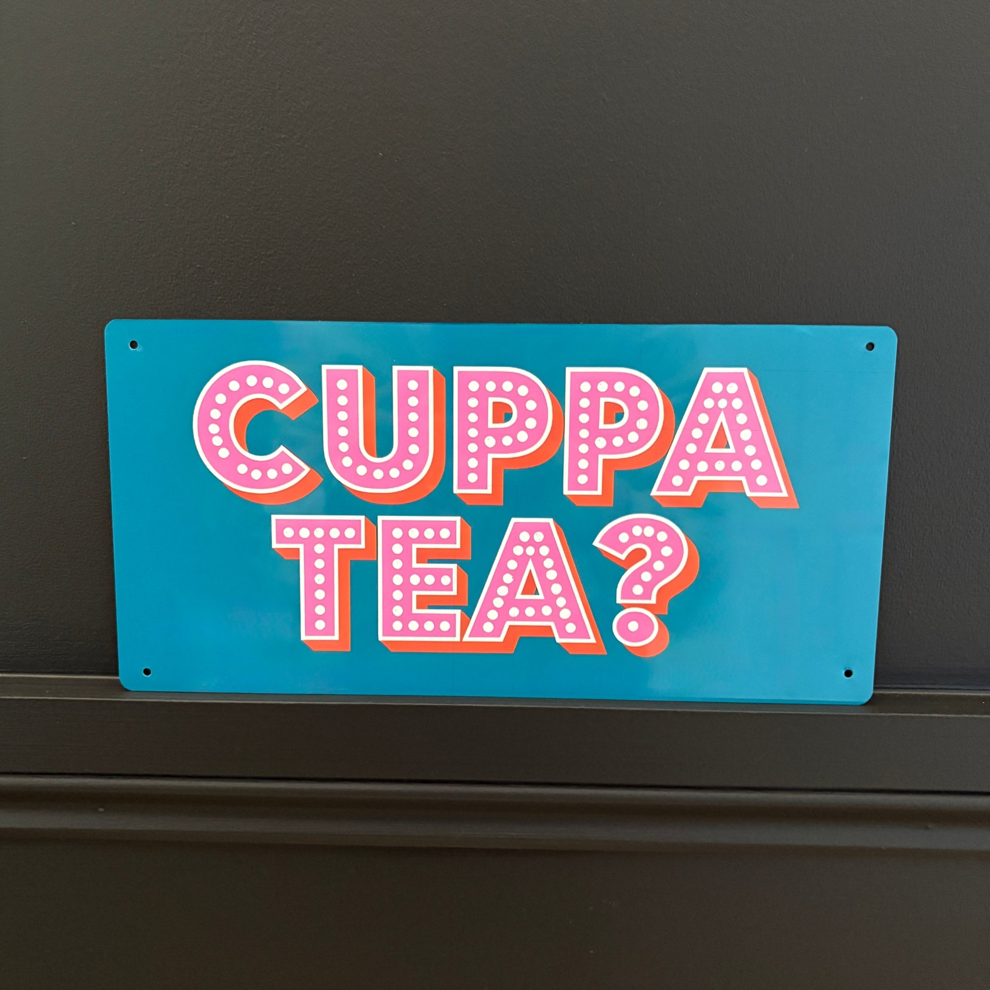 Its bold design features the phrase “Cuppa Tea?” in a playful circus-style font, rendered in bright pink and orange for a lively pop of colour. Fun and memorable, the Tea Sign makes a charming statement on its own or as part of a gallery wall. Perfect for tea lovers or as a quirky gift, it’s a delightful way to add warmth and humour to your décor.